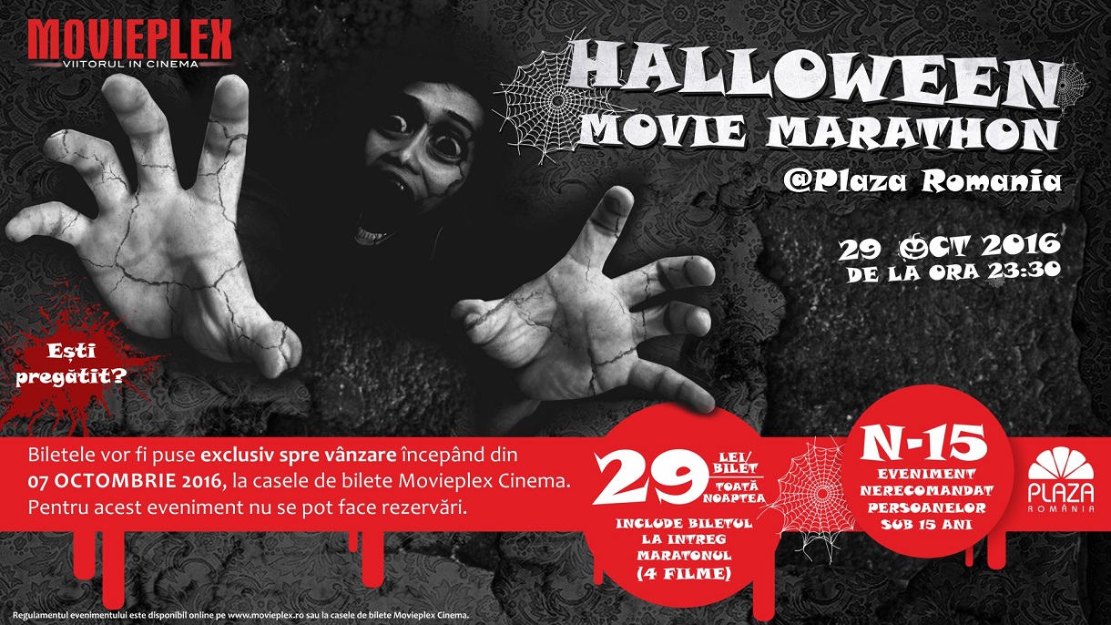 Pe 29 octombrie, de la 23.30, la Movieplex Plaza România va avea loc Halloween Movie Marathon, patru filme horror urmând să ruleze, în aceeași ordine, în 11 săli.